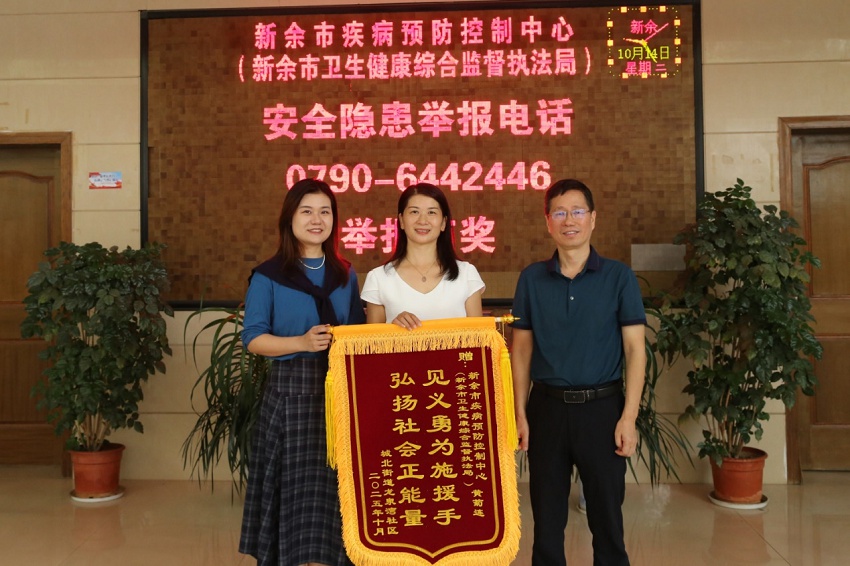 近日,新余市疾控中心黄菊连在北湖公园紧急救助晕倒孕妇的感人事迹传出后,赢得社会广泛赞誉。10月14日上午,黄菊连所在社区--城北街道龙泉湾社区党总支部书记夏倩雯专程来到市疾控中心,将一面印有“见义勇为施援手 弘扬社会正能量”的锦旗送至黄菊连手中。中心党总支部书记陈爱劳陪同参加赠旗仪式。两位书记对黄菊连在危急时刻挺身而出的行为表示高度赞扬,称赞她以实际行动展现了新时代疾控人员的担当与温度。黄菊连表示感谢社区和单位的认可,自己只是做了一名普通市民应该做的事。此次送旗不仅是对个人善举的褒奖,也进一步激发了广大干部职工传递温暖的热情,激励更多人以实际行动践行社会责任,弘扬文明新风。